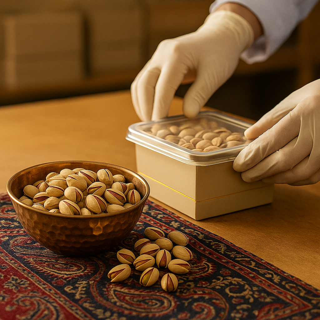 Our Ahmad Aghaei pistachios are carefully harvested and processed. They are prepared without the use of chemicals or artificial preservatives, ensuring that their natural flavor and characteristics are preserved. After harvesting, the pistachios are packaged in durable, hygienic packaging to maintain their freshness and quality during transport. Our packaging is designed to ensure that the product reaches international markets in perfect condition.
